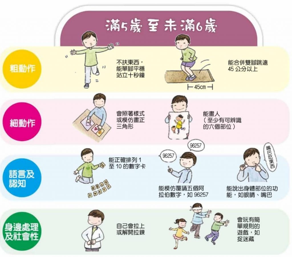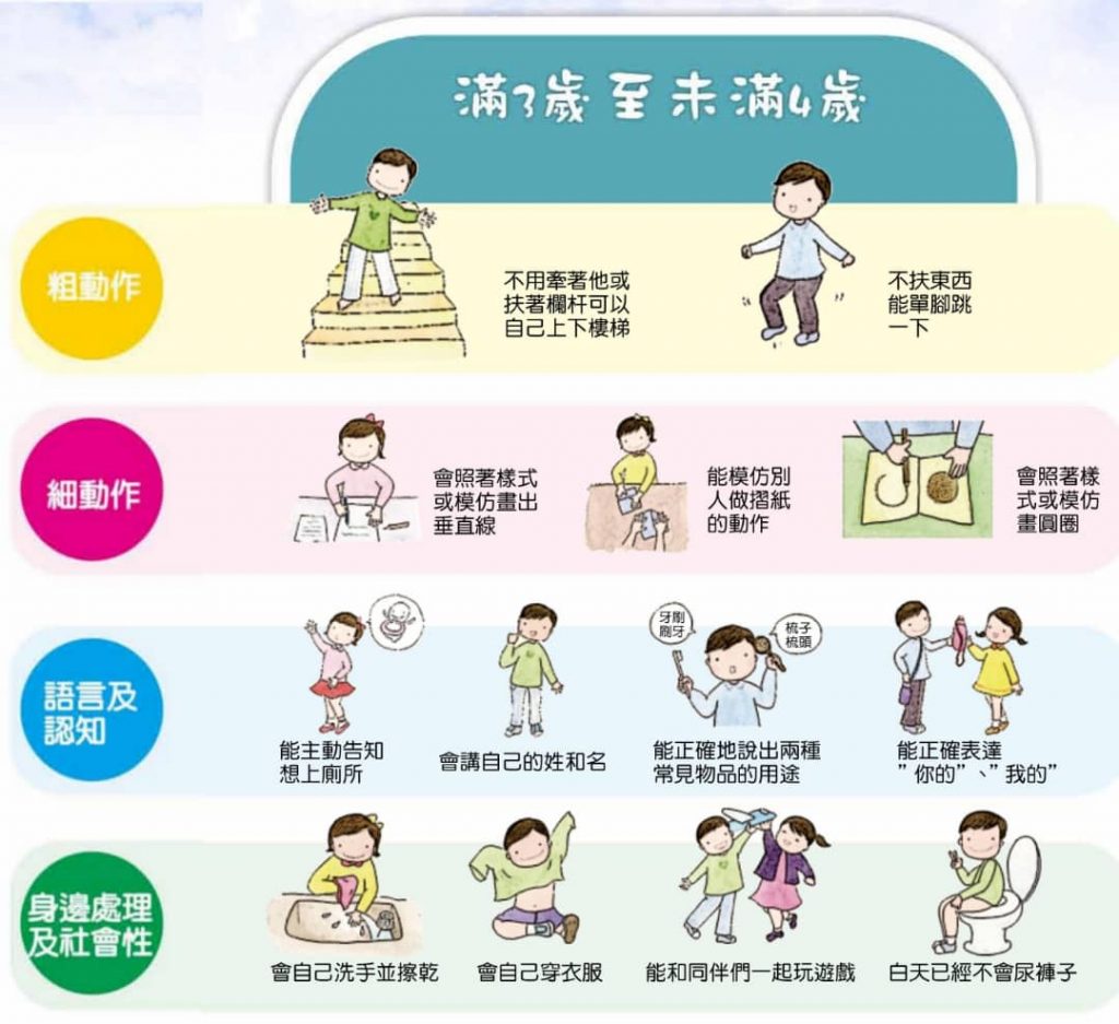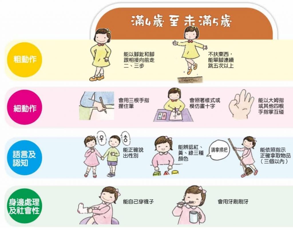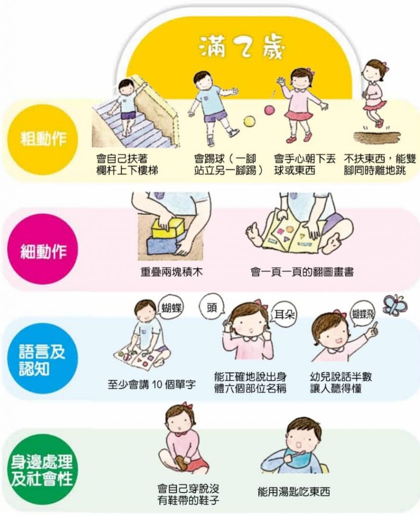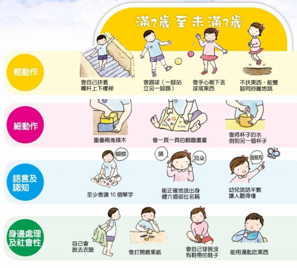 請家長檢視孩子各年齡層的發張狀況,如果有兩個以上表現不符合,請帶孩子接受專科醫師進一步檢查,或洽詢各早期療育服務單位。