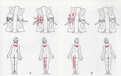 患者在活动躯干时可能会有一些受限或者出现疼痛弧。为了避免了疼痛,我们可观察到椎间盘突出患者的躯干会出现姿势上的偏移。患者可能会侧弯到非疼痛侧或朝疼痛的一侧弯曲,这都取决于椎间盘突出的程度和方向。